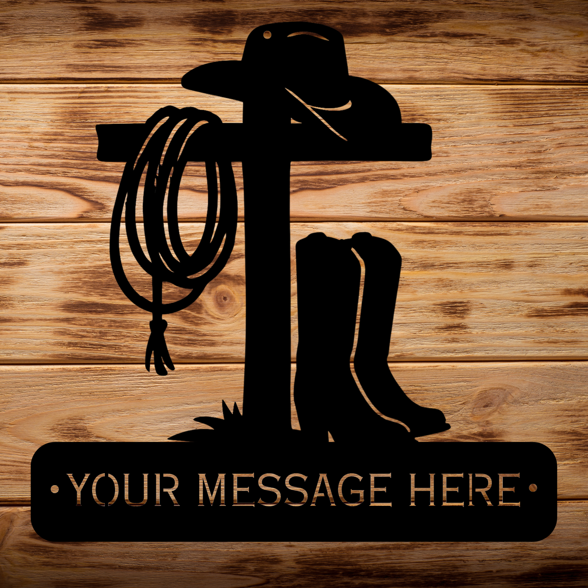 Celebrate faith, hard work, and the Western spirit with this unique metal wall art. The cross, cowboy hat, and rope speak of steadfast belief, while the boots remind us of the journey walked with courage. A heartfelt accent for any space, designed to stand strong indoors or out.